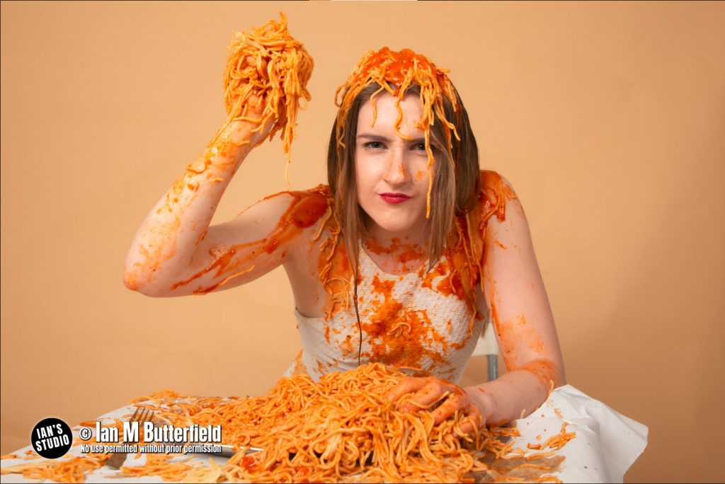 I’ve always held to the belief that events at the studio should be fun, both for the photographers and for the model(s). I’ve also always tried to offer events that not only encompass training and mentoring but enable photographers to create images that perhaps they wouldn’t be able to create in other circumstances. In 2019 I ran a messy shoot with model SimplyB that included this setup of a spaghetti fight.
